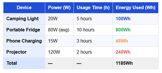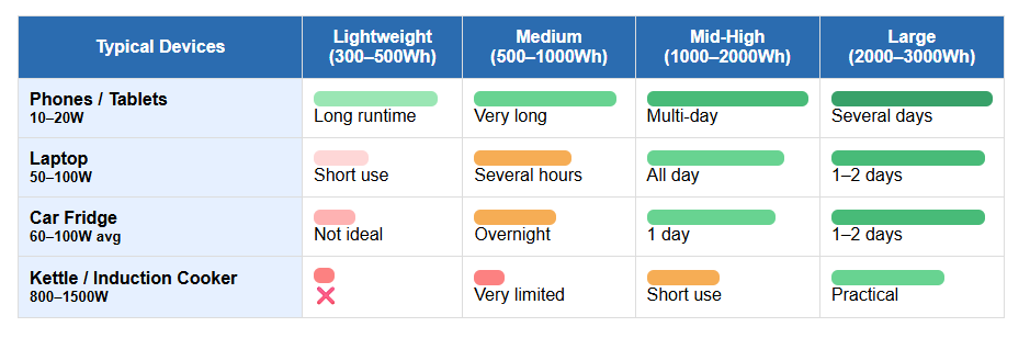 Ideal for short trips, weekend camping, and outdoor activities. Can power a car fridge, small electric kettle, or low-power cooking devices for short periods. - Mid-to-High Capacity (1000–2000Wh)