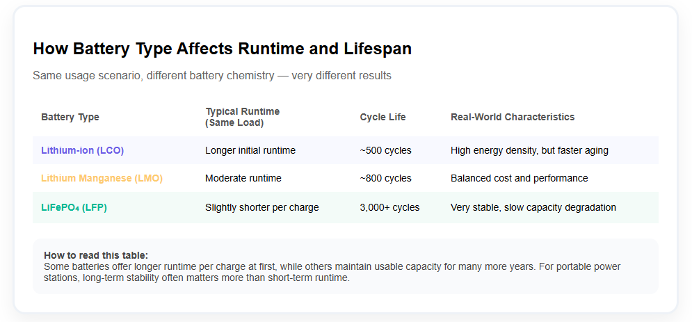 Battery type doesn’t change how much energy you get per charge—but it affects how consistently you can use that energy over years.
