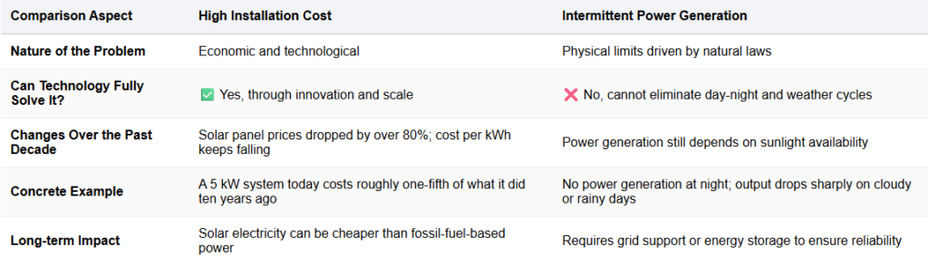 Unlike cost issues, which can be addressed through technological breakthroughs, the physical dependency of solar on sunlight is unchangeable — the day-night cycle, seasonal shifts, and weather variations are laws of nature. Even if future panel efficiency improves dramatically, generating power at night or efficiently on cloudy/rainy days remains highly challenging. In the long run, cost is a “temporary, solvable” issue, while the instability caused by intermittency is “permanent and fundamental,” making it the more core downside of solar power.