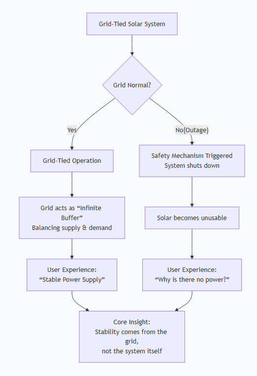 Many users with installed solar systems perceive their “power supply as stable,” but this is largely due to the “buffering effect” of grid-tied solar systems.