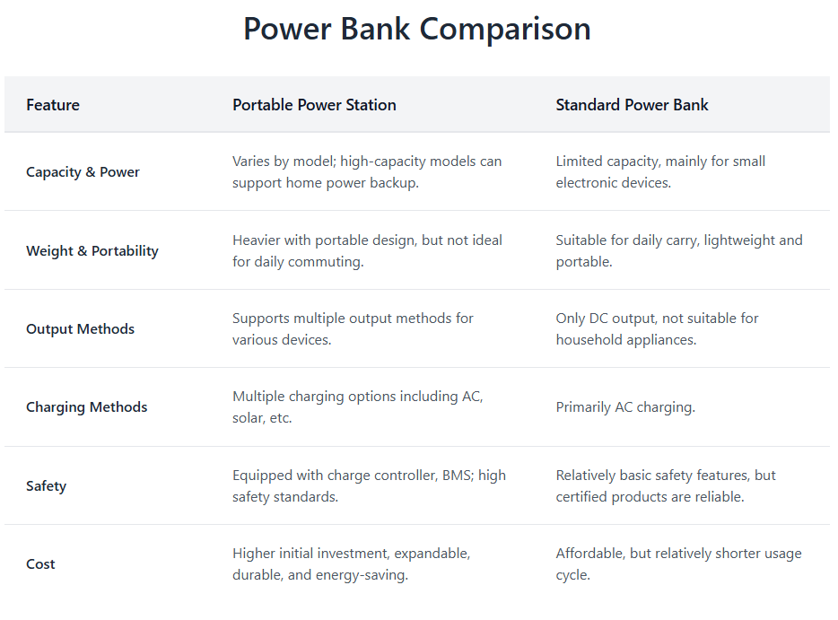 There’s no clear “better” or “worse” option. It really depends on how you plan to use it. In general, power banks are smaller and more portable, designed mainly for phones and small devices. Portable power stations offer much larger capacity while still being mobile, making them ideal for camping, outdoor trips, and even home backup power.