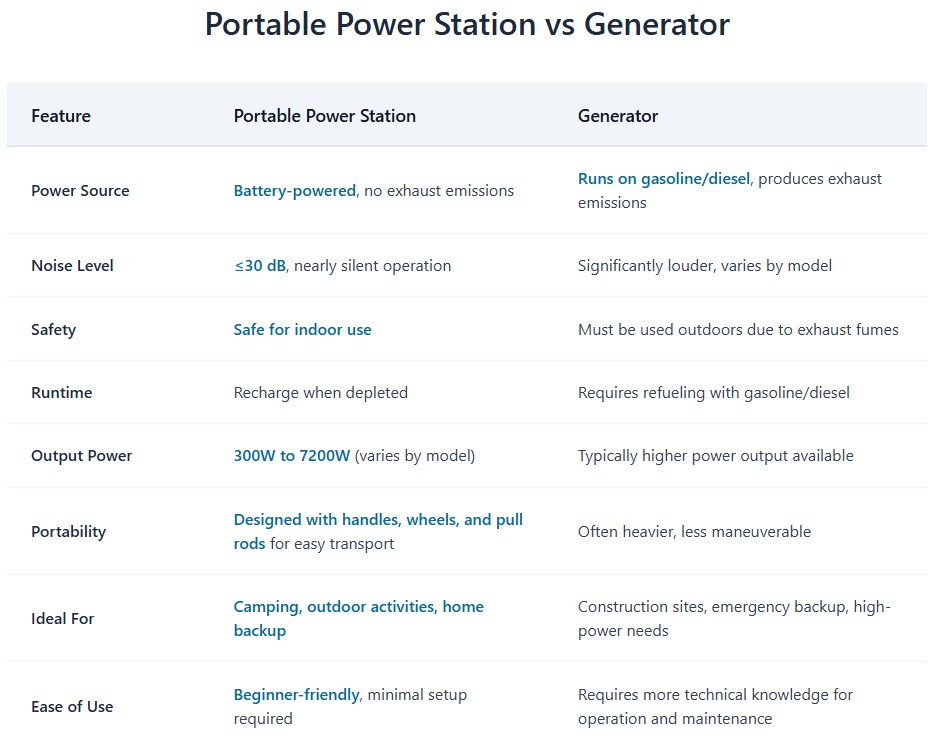 Besides power banks and portable power stations, generators are another common energy solution. Below is a comparison table to quickly show the differences between portable power stations and generators.