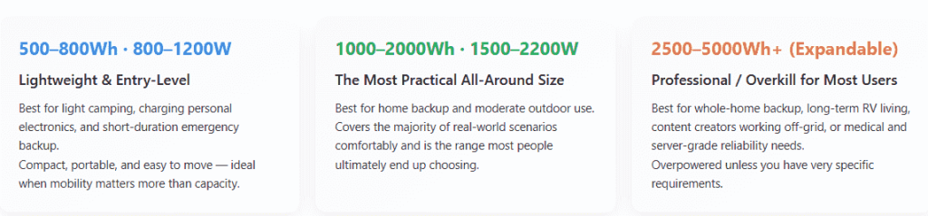 The same goes for home backup vs. camping. Even if the devices look similar, the way you use them is totally different. That’s why portable power stations for home use and outdoor use can’t be sized with the same logic.
