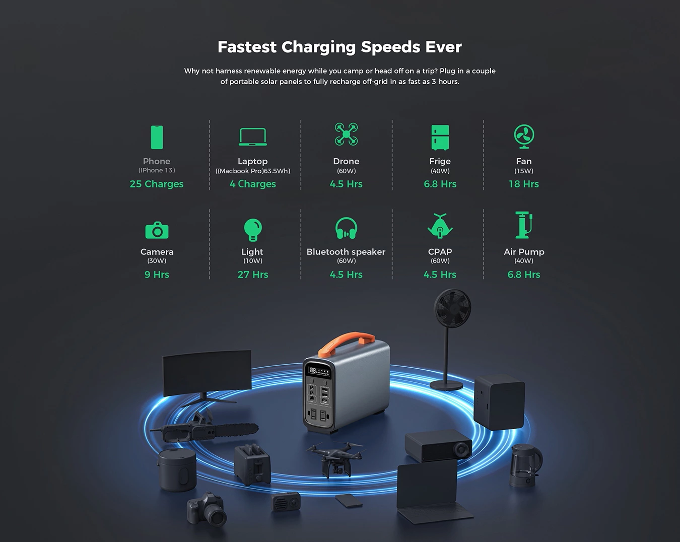 Our product is suitable for various scenarios including outdoor activities, home emergency backup, and mobile work. This power station is the ideal choice for mid-to-low power applications, frequent use, and powering multiple devices. The safety and exceptional lifespan of its LiFePO4 battery ensure reliable and worry-free operation in any situation.