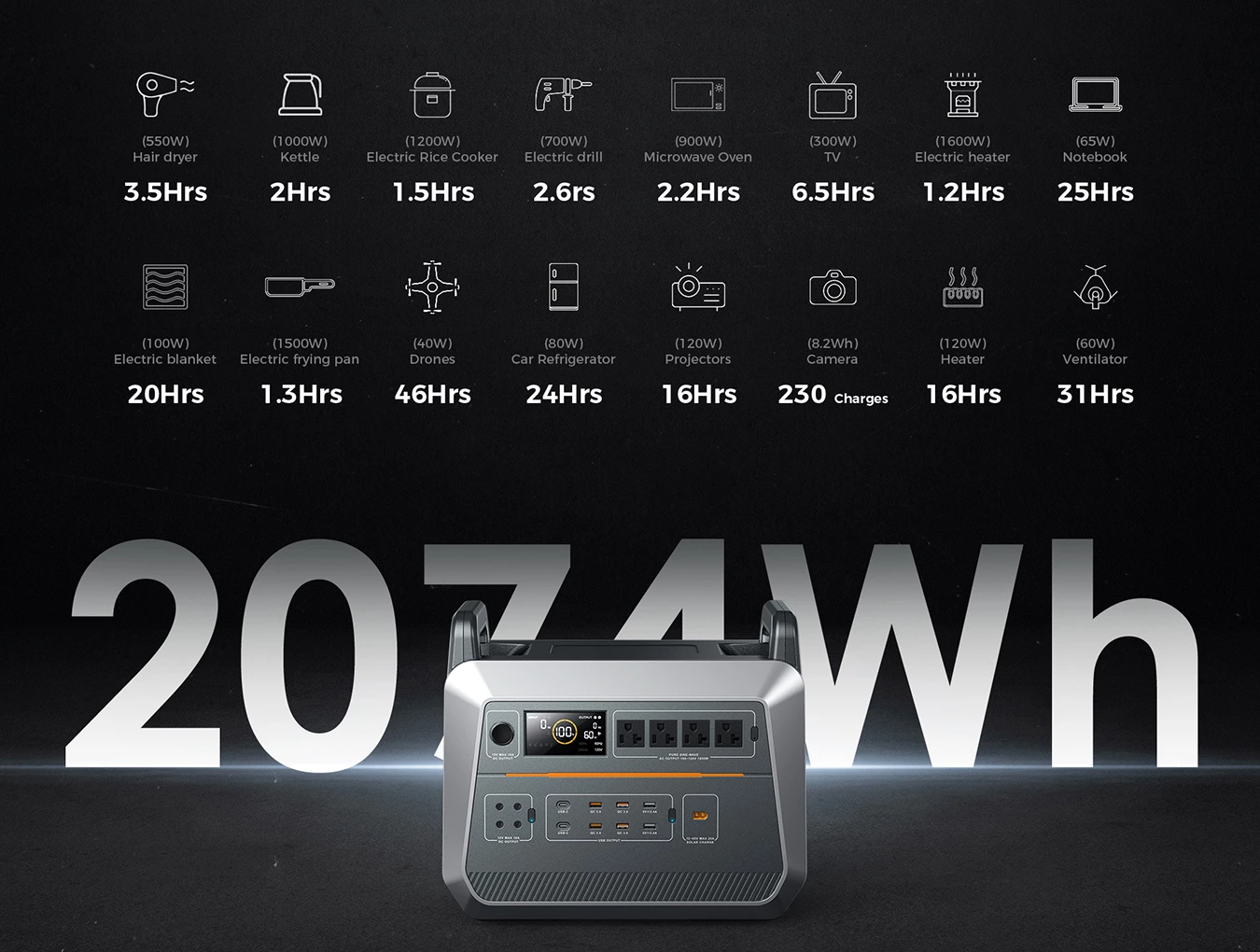 Power Supply: Powered by a massive 2073Wh LiFePO4 (Lithium Iron Phosphate) battery with an ultra-long cycle life of up to 3500 charges. It features a 2000W rated power pure sine wave AC output with a peak power of 4000W, capable of running the vast majority of high-power appliances and tools on the market.